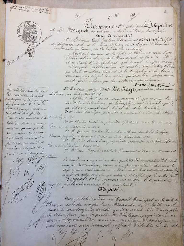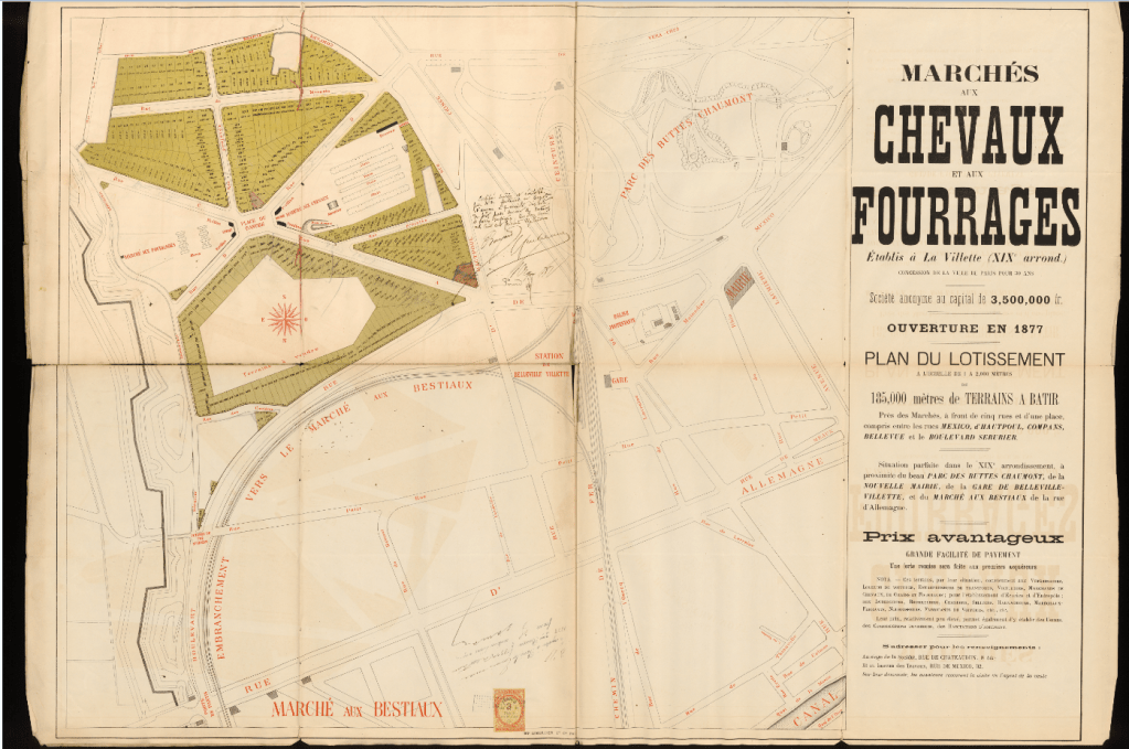 (3) Traité entre la Ville de Paris et la Société des marchés aux chevaux et aux fourrages de Paris, chez Me Delapalme Jules-Emile, notaire à Paris, du 20 mai 1875 – Archives Nationales, MC/ET/XCIII/766