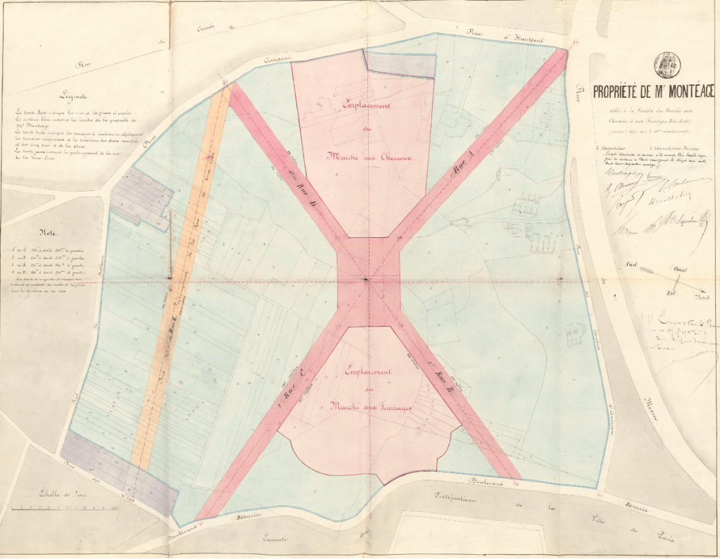 Le Traité du 20 mai 1875 est conclu entre la Ville de Paris et la Société des marchés aux chevaux et aux fourrages de Paris, que Jacques Montéage a constituée avec quelques personnes – comme on verra plus loin – et à laquelle il apporté les 254 670 m² de sa propriété.