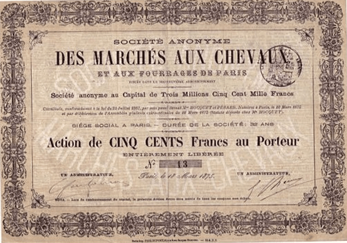 La Société des marchés aux chevaux et aux fourrages de Paris est constituée le 20 mars 1875, après que ses statuts ont été déposés le 10 mars 1875 chez Maître Constant Hocquet, notaire à Paris [13].