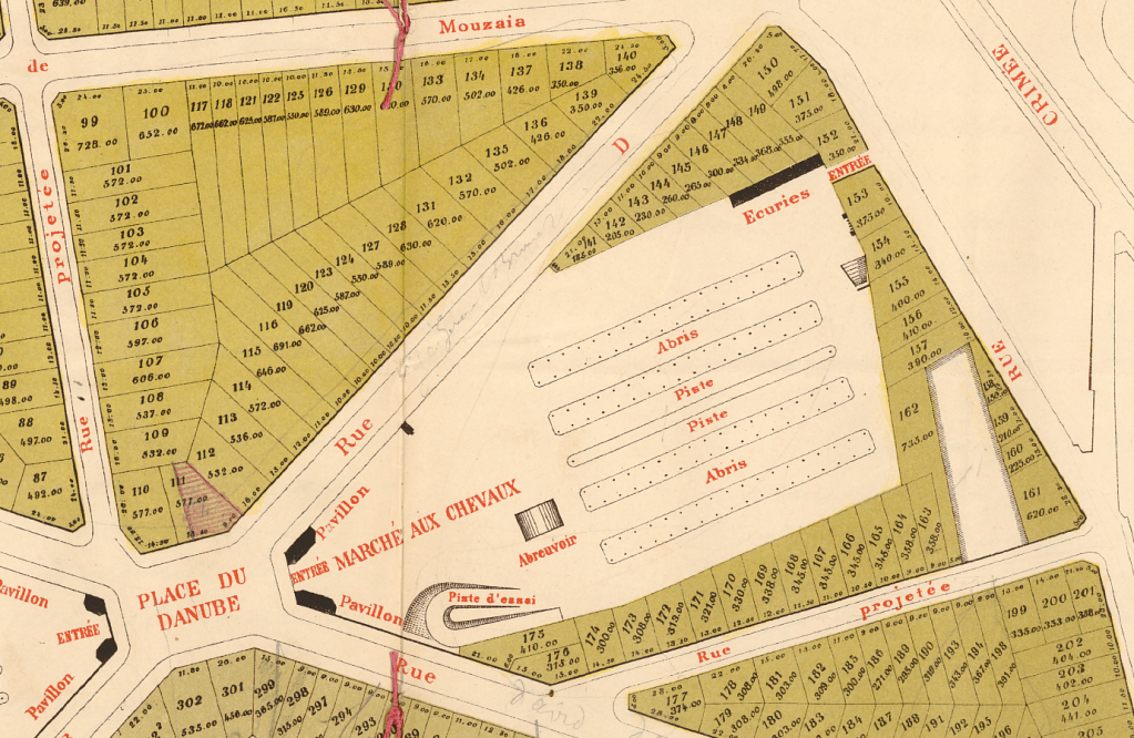 Le Traité est conclu le 20 mai 1875 et les travaux sont engagés rapidement. Pour combler les carrières et niveler les terrains, les terrassiers allaient remuer à la pelle 900 000 m3 de terre [14]… Dès 1875, la « cinquième voie » – qui deviendra la rue de Mouzaïa – est percée. En 1877, la place, aujourd’hui place du Rhin-et-Danube, et les quatre voies, aujourd’hui rues du Général-Brunet et David-d’Angers, sont ouvertes. En 1878, les deux marchés sont achevés. « Le marché aux chevaux couvrait l’espace compris entre la place du Danube où il avait son entrée, et les rues David-d’Angers, du Général-Brunet et Compans. Il comprenait quatre halles métalliques pouvant abriter plus de mille chevaux et des pistes d’essai entre les bâtiments. En face de ce marché, à l’emplacement actuel de l’hôpital Hérold, le marché aux fourrages comprenait deux vastes bâtiments en matériaux légers. [15]»